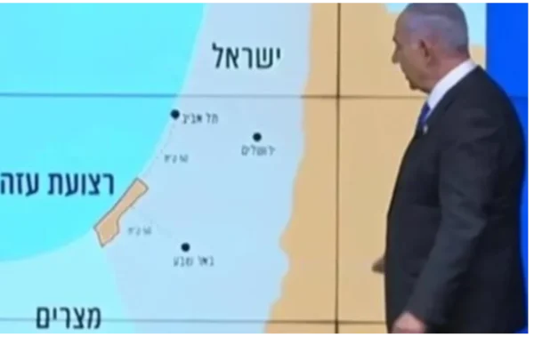 2 сентября 2024 года Нетаньяху выступил на фоне карты, где оккупированная евреями палестинская территория Западный берег реки Иордан включена в состав Израиля. Самый большой в мире концлагерь сектор Газа отобразили, но это пока, в будущем и его сотрут. Ранее в июле парламент Израиля принял резолюцию с решительным отвержением создания Палестины.