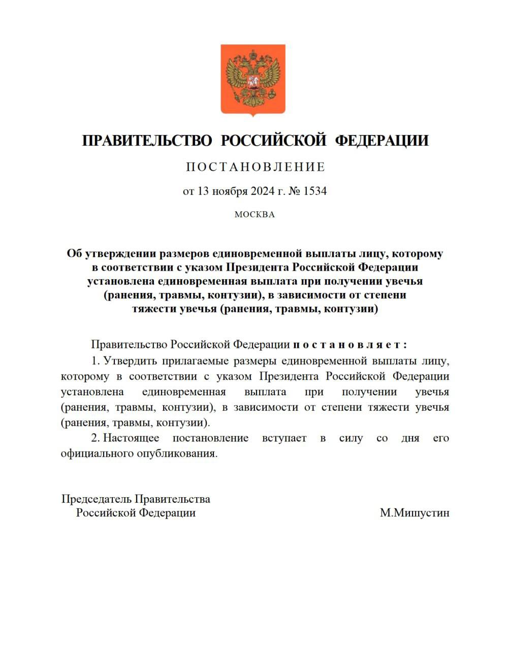 А вот и нормативная база под согласованное ранее решение о различных выплатах по ранениям нашим военным: