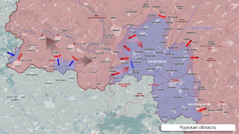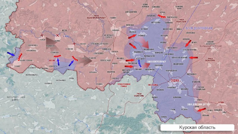 ▪️Из Глушковского района поступает немало противоречивой информации. Достоверно можно сказать, что ВСУ присутствуют на нашей территории в зоне населенных пунктов Веселое (что примерно в 3 км от госграницы), Новый Путь, Медвежье. Реализуется сценарий, который просматривался, как минимум, с первого дня контратак нашей армии — ВСУ нацелены на выход к станции Глушково, и пока это выглядит задачей-минимум.