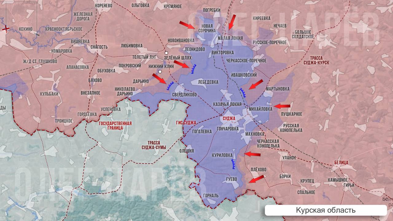 ▪️Также российские военные давят с противоположного фланга, штурмуя Погребки и планомерно двигаясь к отрезанию Малой Локни. Потеря этого района повлечет для ВСУ развал всей линии их обороны севернее Суджи, в том числе усложнит удержание Леонидово и участков вокруг Новоивановки.