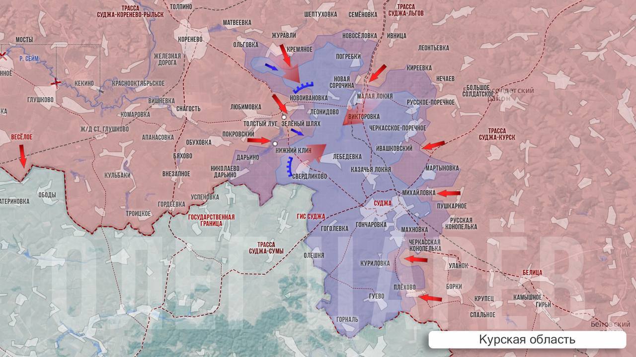 ▪️Самые активные бои разворачиваются на участке между селом Новоивановка, которое наши уже зачистили, и Викторовкой, в сторону которой наши атакуют и стараются продвинуться. Таким образом самые ожесточенные столкновения идут за трассу Зеленый Шлях-Малая Локня, как и ожидалось. За Леонидово бои тоже еще идут и тоже тяжелые. Мотивация ВСУ, как я не раз писал, ясна: с Викторовкой и Леонидово они гарантированно теряют позиции севернее это трассы, находящиеся там подразделения остаются отрезанными. Плюс контроль над трассой дает нашим военным подход к Малой Локне, вслед за которой наступление, очевидно будет идти на Суджу.
