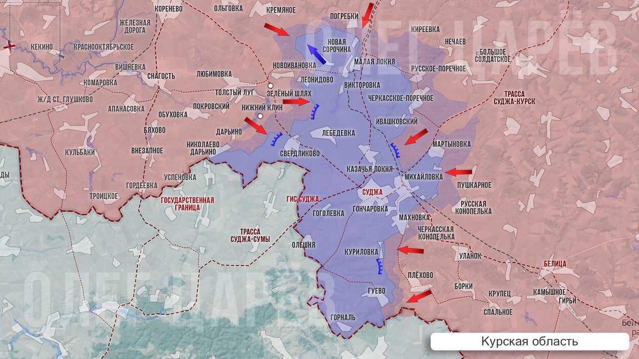 ▪️ВСУ предприняли контратаку, чтобы вернуть под свой контроль Плехово, потеряли один Bradley и отступили. Западнее Плёхово наши войска ведут наступление и уже подступили к Куриловке. Передовые части ВС РФ форсировали реку Псёл к югу от Суджи и ведут наступление в районе поселков Гуево и Горналь. В Гуево наши войска пока не зашли, идет массированная артиллерийская обработка вражеских сил у села вдоль берега реки.